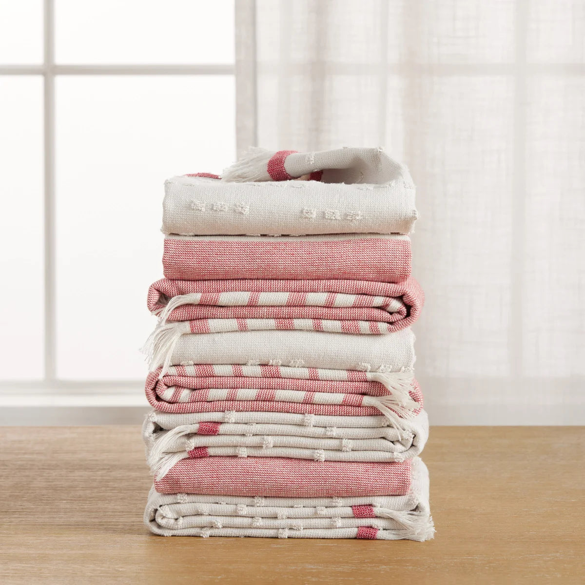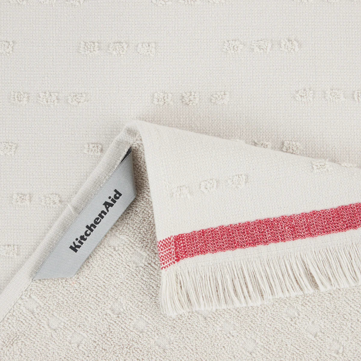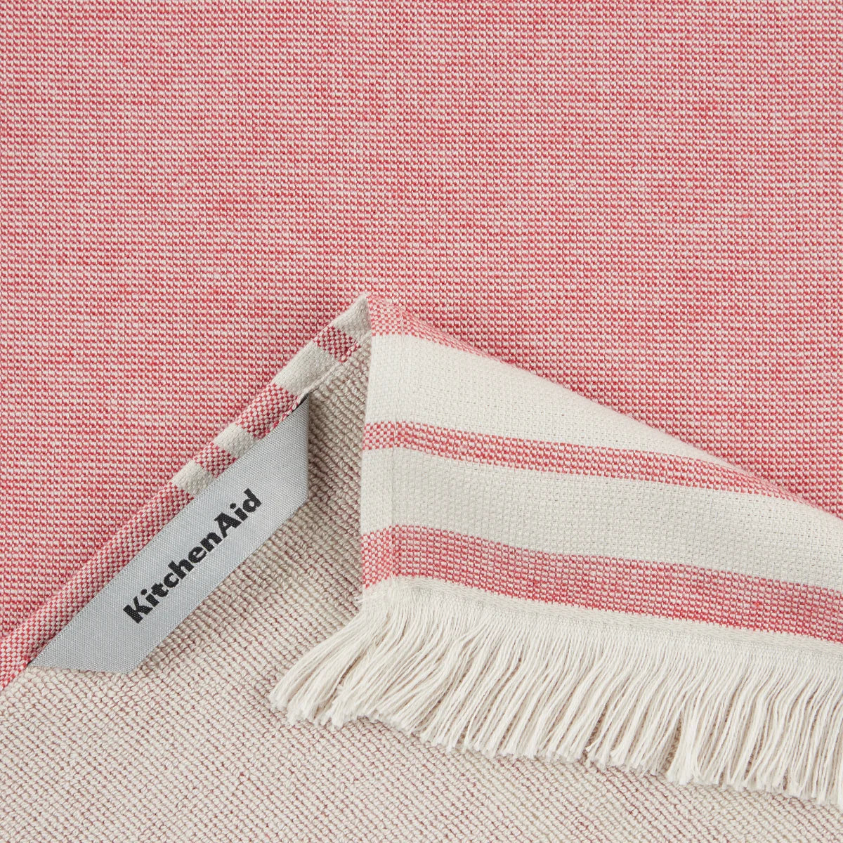 Bring some fun to your kitchen with the KitchenAid Vintage Stripe Kitchen Towel set. Made of 100% Cotton with textured designs and fringe edge, these kitchen towels are both decorative and functional. This beautifully constructed kitchen set features eight dual-purpose kitchen towels measuring 28" x 17". Each towel features a convenient hang loop for drying and easy storage, and they are machine washable for effortless maintenance.